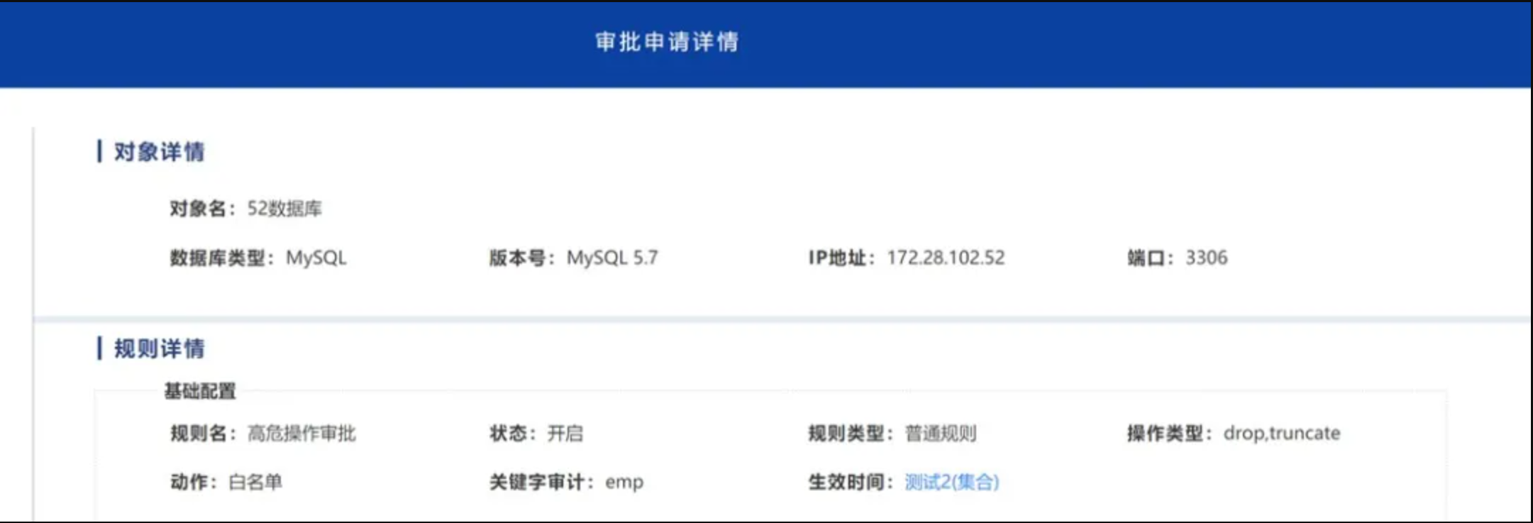 高危操作審批。數(shù)據(jù)庫防火墻集成審批電子流程,也可以與OA系統(tǒng)對接。針對確實(shí)需要進(jìn)行高危操作的運(yùn)維或開發(fā)人員,可在數(shù)據(jù)庫防火墻上提交高危操作的審批的工單,工單審批通過后,操作員可操作工單中的內(nèi)容,數(shù)據(jù)庫防火墻會在一定時(shí)間內(nèi)放行,通過此功能,可對高危操作進(jìn)行有效管控,在不影響業(yè)務(wù)的情況下保障運(yùn)維安全。